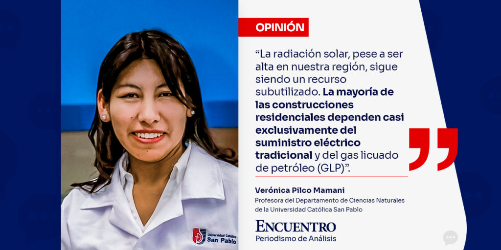 Verónica Pilco Mamani Profesora del Departamento de Ciencias Naturales de la Universidad Católica San Pablo La región de Arequipa enfrenta actualmente un proceso de transformación que exige repensar su modelo energético, especialmente en el ámbito habitacional. En un contexto de crecimiento urbano, aumento de la demanda eléctrica y vulnerabilidad ambiental, la transición hacia fuentes renovables […]